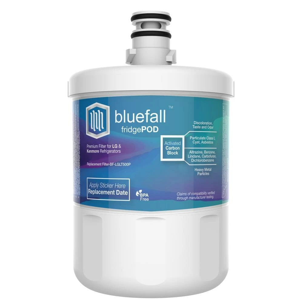 So it’s time to replace your fridge’s water filter. If you’re looking for premium OEM quality without paying double for the logo on the label, this filter is for you. All Bluefall FridgePod filters feature the Drinkpod +3 Advanced Purification process. Our filters are manufactured to be lead free, with natural coconut-based cores, and bpa-free housings, in an ISO9001 facility. Additionally, all filters are certified and tested by NSF and IAPMO^ for material safety and structural integrity. Purification: our +3 Advanced Purification process has been optimized for your LG or Kenmore refrigerator to improve your drinking water in three specific ways. • Particle scrub: through the use of mechanical reduction, this scrub utilizes the filter core’s compressed micropore structure to trap particles. Effective for greatly reducing contaminants like cysts, rust, and other sediments down to 2~5 microns. • Chemical scrub: A chemical reduction process that uses the filter core’s oleophilic surface to attract organic compounds and non-polar contaminants, which it adsorbs onto its surface. Effective for reducing common disinfection byproducts (THMs), organic contaminants like chlorinated solvents, pesticides, and other industrial pollutants. • Polishing scrub: utilizes pressure to force-diffuse your water across the filter’s vast micropore surface area to consistently expose and reduce dangerous and aesthetic contaminants. A single filter core’s surface area can exceed 1/2 million square feet. Effective for improving the safety of your drinking water while greatly reducing undesirable taste, odor, and color.