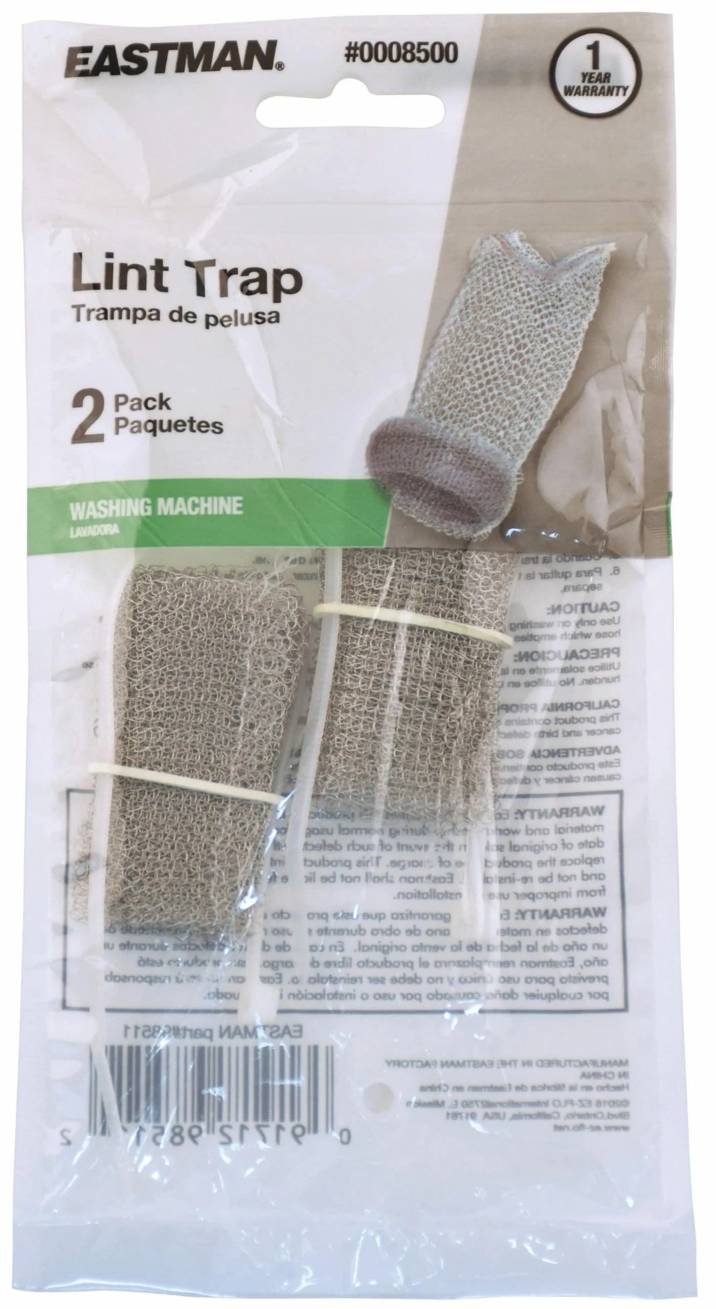 The EASTMAN lint trap stops lint from clogging a laundry tub or sink. The trap slips easily onto the end of a washing machine drain hose and includes zip ties to secure it to the hose.