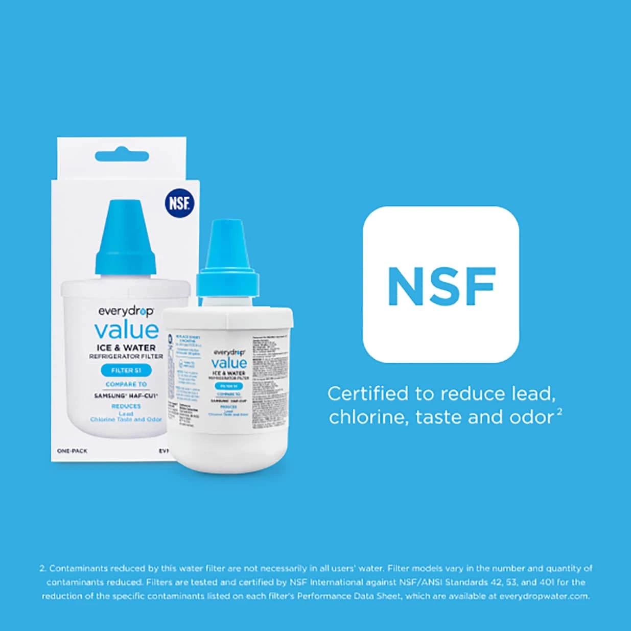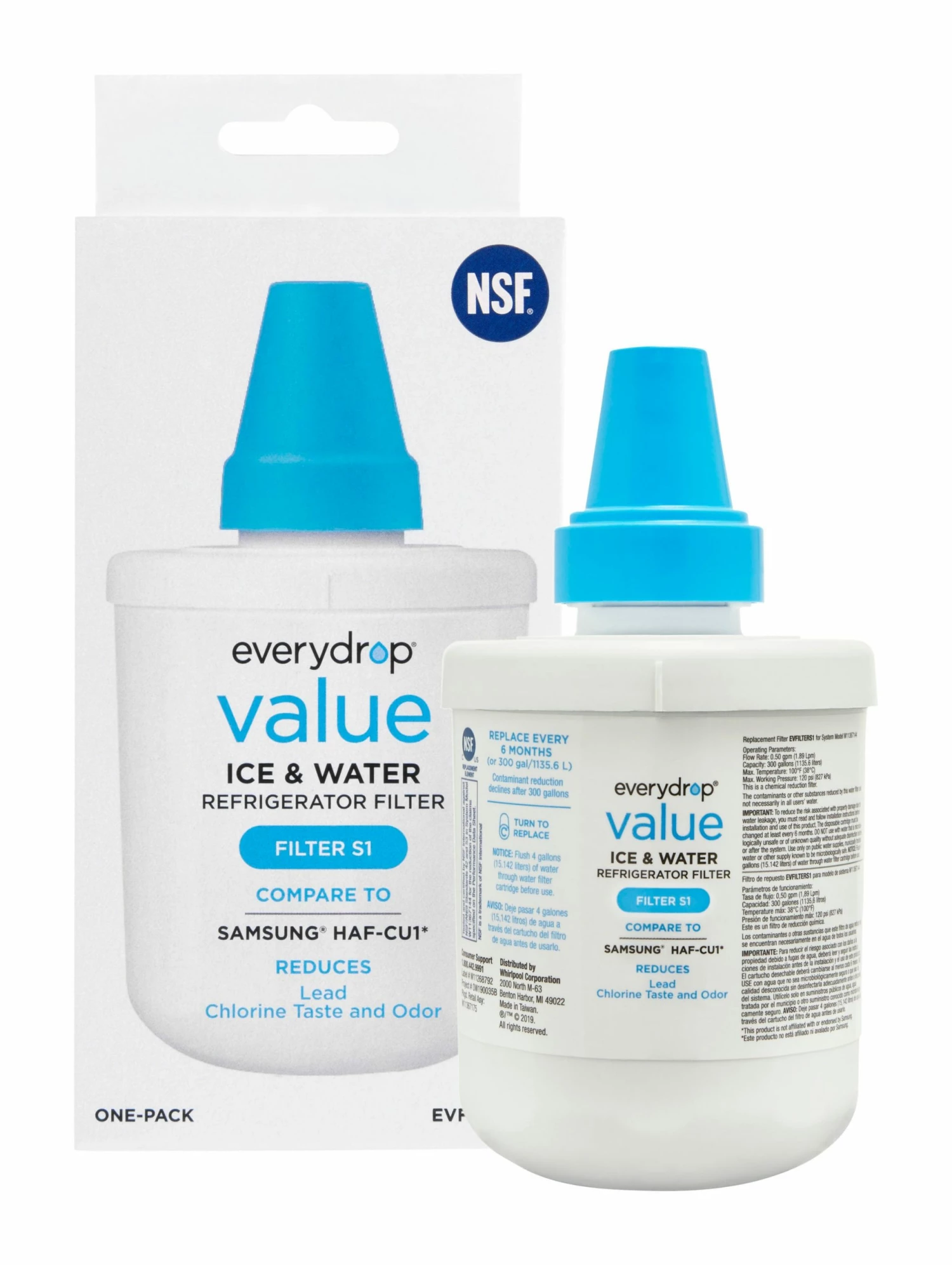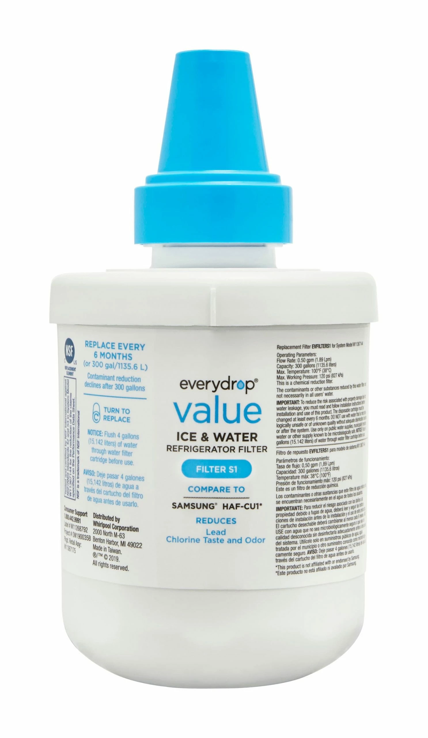 Certified to reduce lead, chlorine, taste, and odor, everydrop® value filters offer convenient, filtered water for you and your family. For the cleanest water, replace your everydrop® value filter every 6 months (or 300 gallons). everydrop® value Ice and Water Refrigerator Filter S1 compares to Samsung® HAF-CU1.