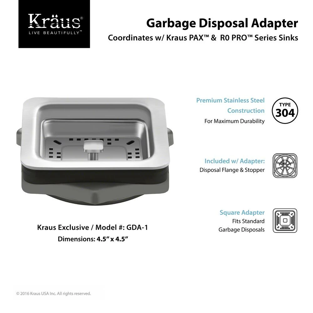 Designed with clean lines and sleek shapes, Kraus kitchen accessories provide everyday efficiency with style. The square garbage disposal adapter coordinates with all Pax™ and R0 Pro™ Series stainless steel sinks, and is compatible with most Insinkerator, Whirlpool, and KitchenAid garbage disposal units. The simple, precise design adds to the clean look of a contemporary kitchen. For your convenience, a disposal flange and stopper are included with purchase.
