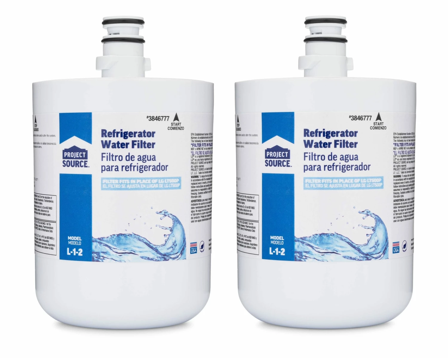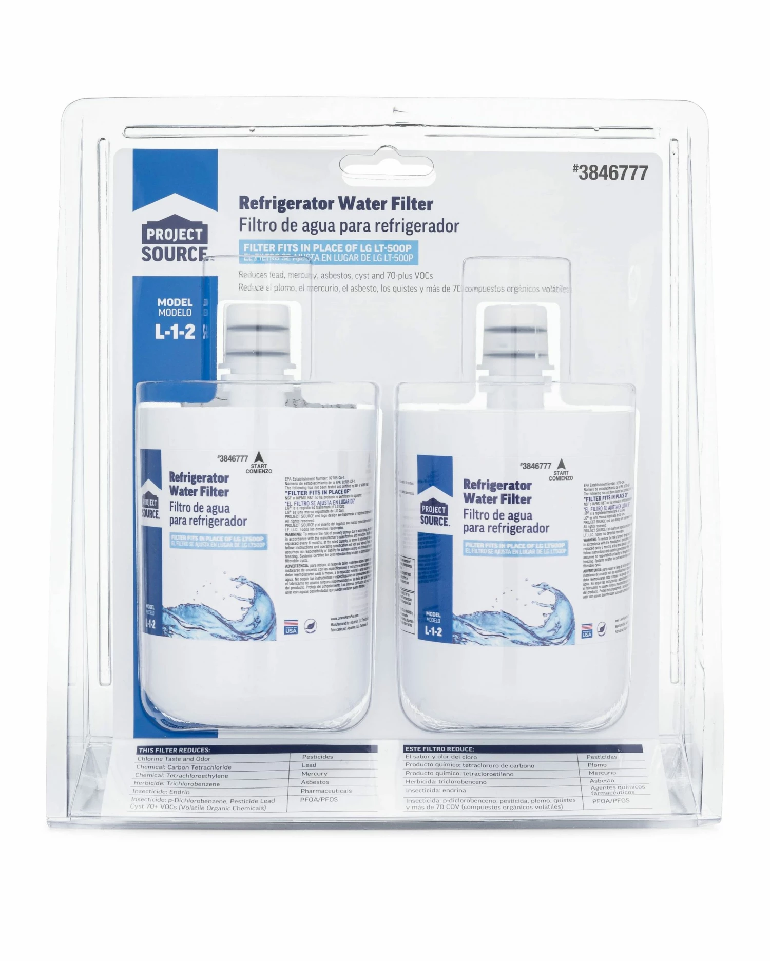 This Project Source L-1-2 replacement refrigerator water filter fits the LG filter model LT500P. This certified, high quality, economical filter will deliver fresh, crisp, clean tasting water and ice cubes. Certified to NSF/ANSI standards 42, 53, 372, 401, P473 and CSA B483.1, this filter removes over 80 contaminants including Lead, Cyst, Mercury and Asbestos. Engineered with the power of 0.5 mic coconut shell carbon block, this filter provides tremendous capacity to reduce impurities, sediment and rust that may be present in your drinking water. The carbon block has millions of active sites on its surface and within the structure which can absorb impurities like a sponge and can breakdown and hold other types of impurities on its surface like a magnet. These processes ensure that you are receiving the cleanest and best tasting water possible for you and your family. Using this filter will replace 1500 water bottles reducing the amount of plastic waste in our landfills.