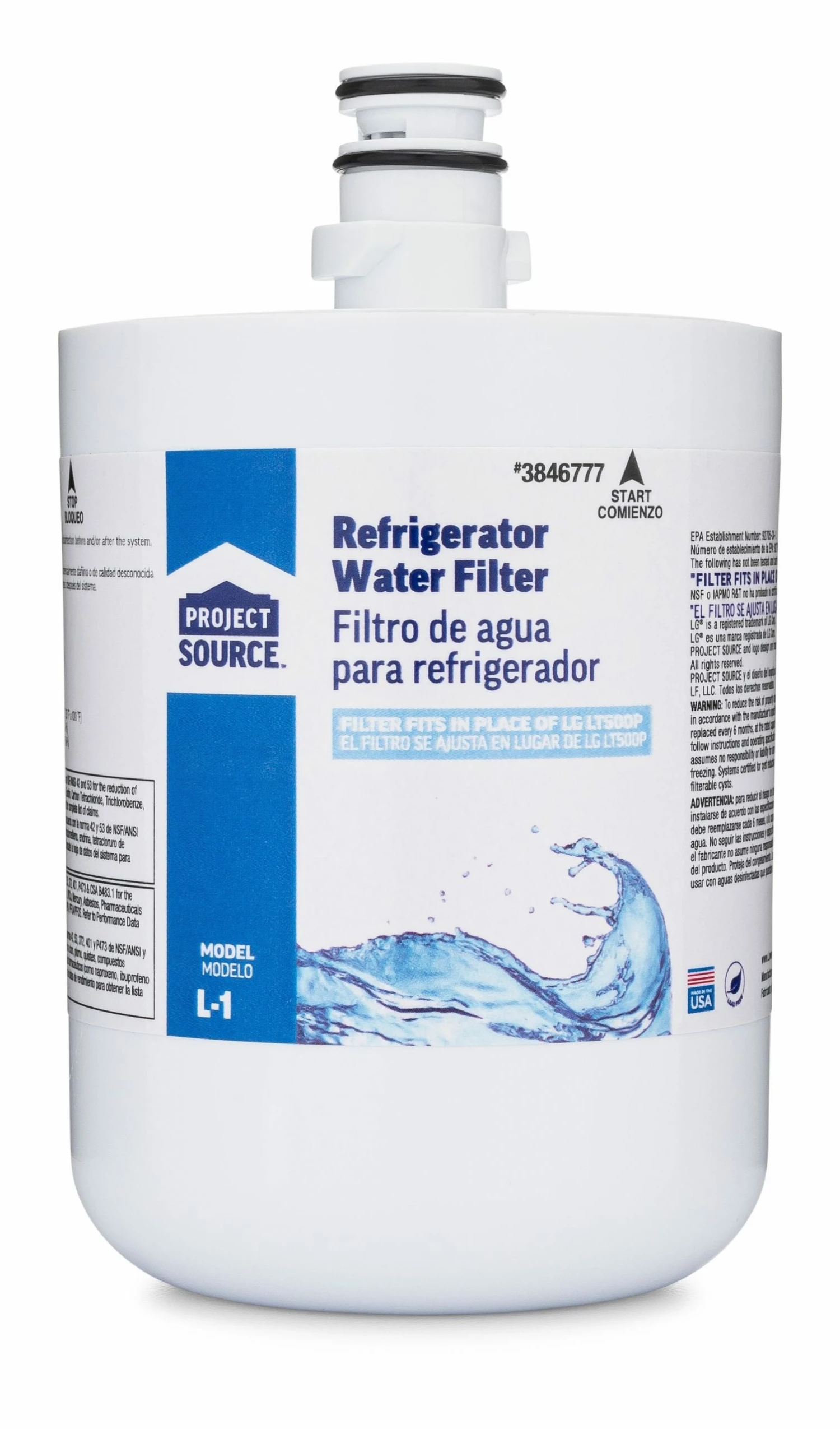 This Project Source L-1 replacement refrigerator water filter fits the LG filter model LT500P. This certified, high quality, economical filter will deliver fresh, crisp, clean tasting water and ice cubes. Certified to NSF/ANSI standards 42, 53, 372, 401, P473 and CSA B483.1, this filter removes over 80 contaminants including Lead, Cyst, Mercury and Asbestos. Engineered with the power of 0.5 mic coconut shell carbon block, this filter provides tremendous capacity to reduce impurities, sediment and rust that may be present in your drinking water. The carbon block has millions of active sites on its surface and within the structure which can absorb impurities like a sponge and can break down and hold other types of impurities on its surface like a magnet. These processes ensure that you are receiving the cleanest and best tasting water possible for you and your family. Using this filter will replace 1500 water bottles reducing the amount of plastic waste in our landfills.