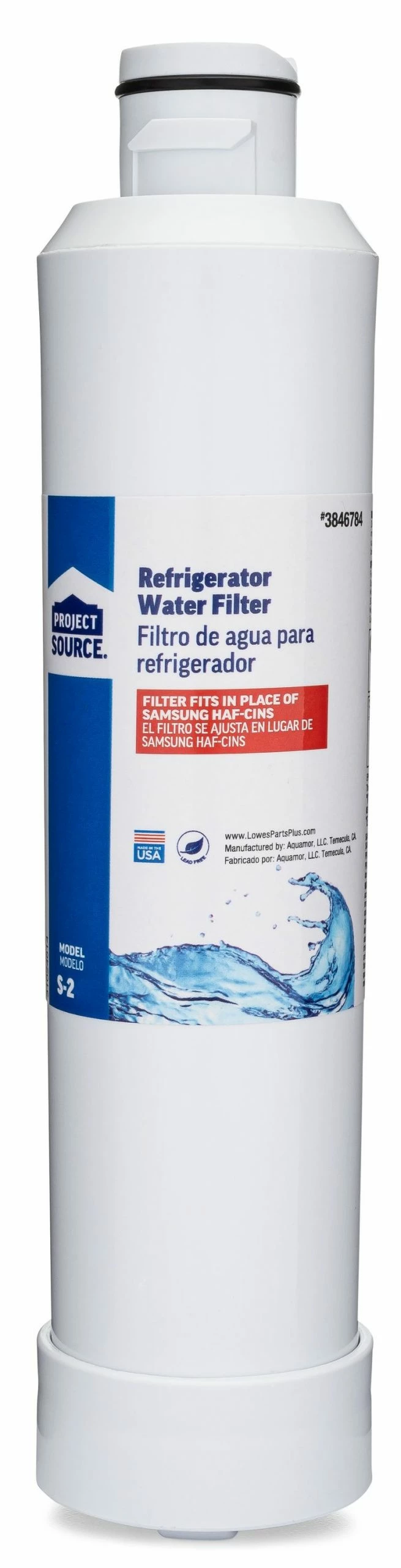This Project Source S-2 replacement refrigerator water filter fits in place of Samsung filter model HAF-CINS. This certified, high quality, economical filter will deliver fresh, crisp, clean tasting water and ice cubes. Certified to NSF/ANSI standards 42, 53, 372, 401, P473 and CSA B483.1, this filter removes over 80 contaminants including Lead, Cyst, Mercury and Asbestos. Engineered with the power of 0.5 mic coconut shell carbon block, this filter provides tremendous capacity to reduce impurities, sediment and rust that may be present in your drinking water. The carbon block has millions of active sites on its surface and within the structure which can absorb impurities like a sponge and can break down and hold other types of impurities on its surface like a magnet. These processes ensure that you are receiving the cleanest and best tasting water possible for you and your family. Using this filter will replace 1500 water bottles reducing the amount of plastic waste in our landfills.