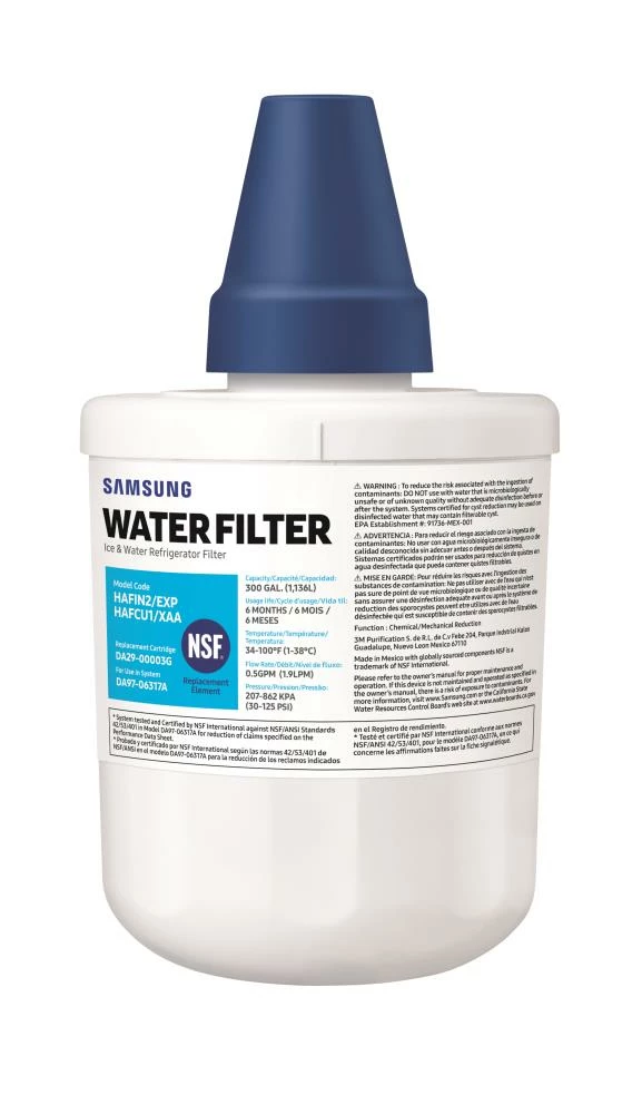 Enjoy fresh-tasting drinking water with this Samsung refrigerator water filter for your Samsung French Door and Side-by-Side refrigerators. Samsung’s ultra-high-grade carbon block reduces 29 potentially harmful contaminants including lead, mercury, chlorine, DEET, pharmaceuticals, herbicides, and pesticides. With a 6-month life and a slim design, this Samsung refrigerator water filter offers long-lasting use and easy installation.