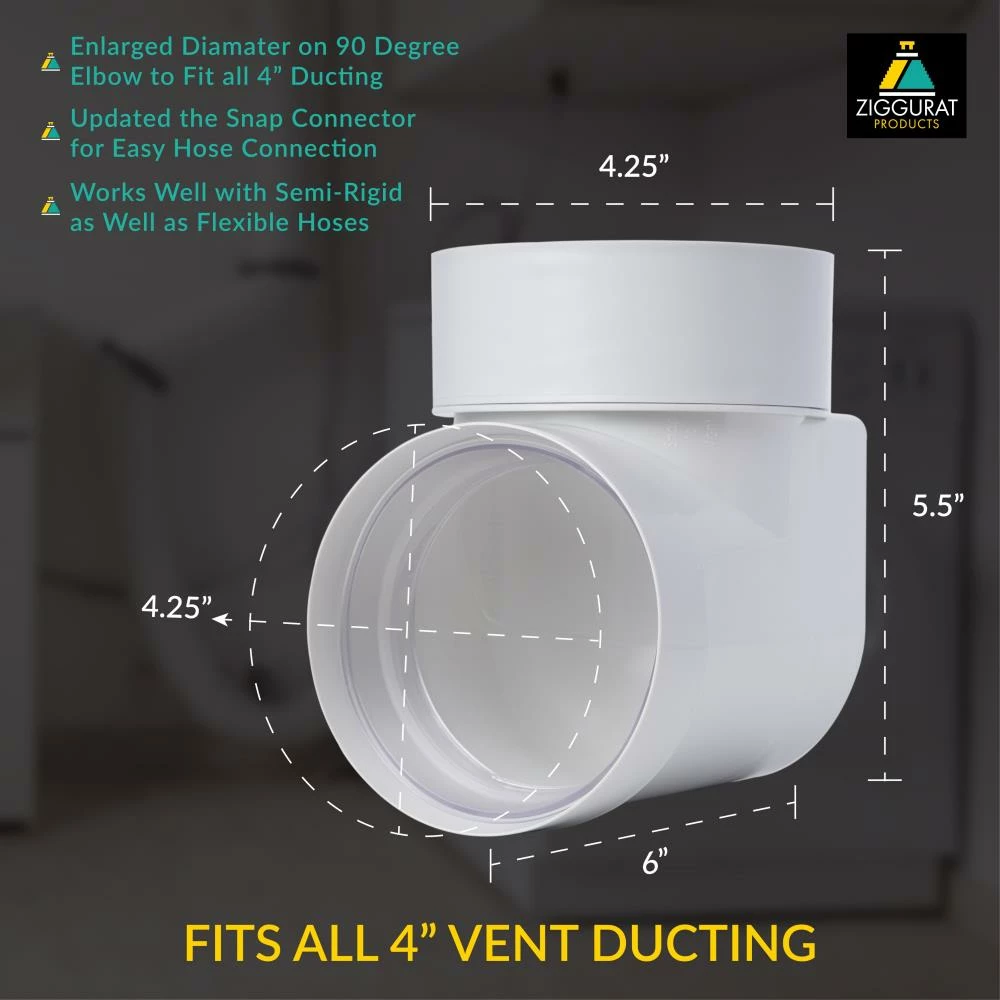 Our STV-DLX snap to vent kit includes our 7 in. x 7 in. diameter wall plate adapter dryer connector and our 5.5 in. L x 6 in. H x 4.25 in. diameter 90Ð elbow dryer connector both of which are made to connect a semi rigid or flexible dryer hose with no hose clamps necessary. These products are also designed to last a long time. With strong, yet flexible materials we have found the perfect way to create a clothes dryer connector that will get the job done for many years to come. Our dryer hose deluxe connector kit is made to be easily cleaned out and is made of quality materials to prevent crushing, ripping or other possible damage to the connection. Install the wall plate adapter into the wall, ceiling, or floor where the dryer vent is and then assemble the hose to the connector, place clear seal ring on dryer vent duct and push connector onto wall plate adapter for a quick, tight, and easy dryer installation. Pre-assemble the hose to the 90Ð elbow dryer connector, place clear seal rings on dryer vent duct and push connector onto duct for a quick, tight, and easy dryer installation. For regular dryer vent cleaning maintenance, simply pull the connectors off the dryer vent ducts for access and push back on when complete. Designed for all 4 in. round dryer vent duct.